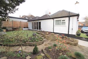 The property is at an elevated position from the road beyond a tall brick wall and a large stone covered driveway which provides off road parking for several vehicles. There is vehicular access along the left side of the property and also a footpath along the right. The private rear garden is beautifully landscaped, with raised flower beds, stone walkways and includes two timber sheds.