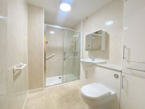 Radiator. Large shower cubicle with seating. Vinyl flooring. Marbrex wall tiles. Built in cupboards housing low level WC and wash hand basin. Extractor fan.