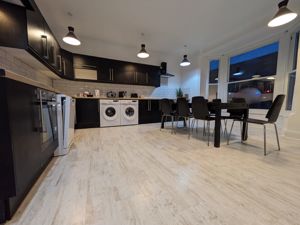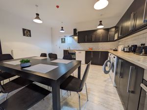 The flat has a large communal kitchen and comes with a spacious dining table. This kitchen is fully stocked and kitted with brand new appliances.